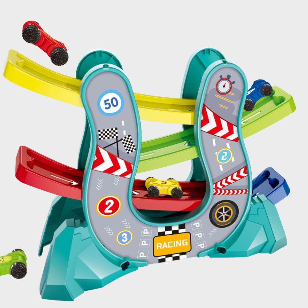 Với các đường trượt nhiều màu và họa tiết đua xe sống động, bộ đồ chơi tạo cảm giác như một đường đua thực thụ. Giúp bé hứng thú chơi mà không bị nhàm chán.