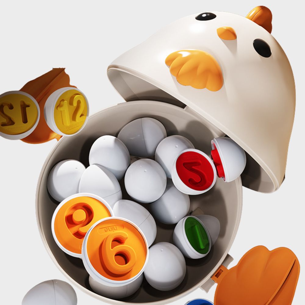 Bộ gồm các quả trứng được tách đôi, bên trong là các con số từ 1 đến 12 với màu sắc bắt mắt. Bé sẽ học cách nhận diện số, phân biệt màu sắc và luyện kỹ năng lắp ghép logic.
